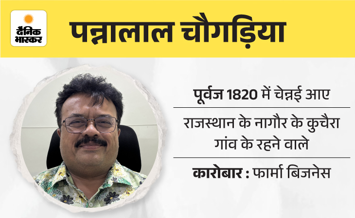 अब उत्तर भारतीयों की बात नागौर के अगरचंद बैलगाड़ी से 2200 किमी चलकर चेन्नई पहुंचे सौकार पेठ में हमारी मुलाकात अगरचंद मानमल परिवार से हुई। अगरचंद 1820 में राजस्थान के नागौर के कुचैरा गांव से बैलगाड़ी से चेन्नई आए थे। उस वक्त राजस्थान में अकाल पड़ा था। परिवार के पन्नालाल चौगड़िया बताते हैं कि मेरे पूर्वजों ने ईस्ट इंडिया कंपनी में भी नौकरी की थी। पन्नालाल का अभी फार्मा सेक्टर में करोड़ों का बिजनेस है। उनके मुताबिक, अगरचंद उत्तर भारत से चेन्नई पहुंचने वाले संभवत: पहले मारवाड़ी जैन थे। उनके बाद उत्तर भारत से कारोबारियों के आने का सिलसिला शुरू हो गया। अगली पीढ़ी में मानमल जी ने बिजनेस शुरू किया। इस परिवार ने मारवाड़ी जैनों को चेन्नई में बसने में मदद की।