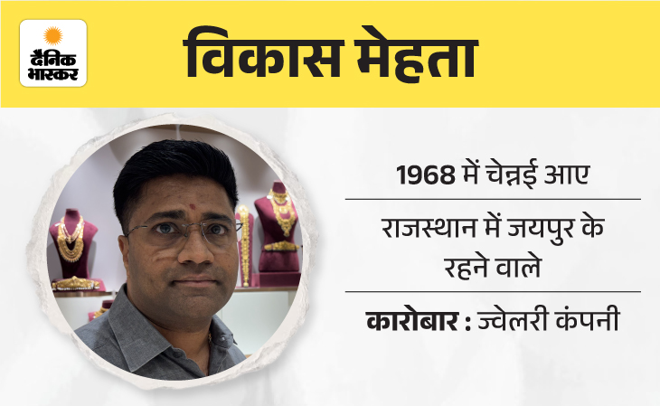 सौकार पेठ में ज्वेलरी की सबसे बड़ी दुकान विकास मेहता की है। उनके दादा राजस्थान में मेथी दाने का कारोबार करते थे। एक बार विकास के पिता पेमेंट लेने चेन्नई आए थे। डीलर ने कहा कि पेमेंट में टाइम लगेगा। वे 20 दिन के लिए यहीं रुक गए।