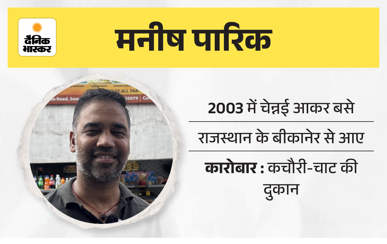 राजस्थान के बीकानेर से चेन्नई आकर बसे मनीष पारिक की भी ऐसी ही कहानी है। वे बताते हैं, ‘2003 में दादा-दादी के साथ चेन्नई आया था। ये शहर पसंद आ गया। पहले छोटी-मोटी नौकरी की। 23 साल से चेन्नई में हूं। मेरी तीन दुकानें हैं। यहां के लोग बहुत अच्छे हैं। वे नॉर्थ की तरह बेवजह परेशान नहीं करते। चेन्नई आने के दो साल में ही मैंने तमिल सीख ली। अब तमिल में कस्टमर से डील करता हूं।’