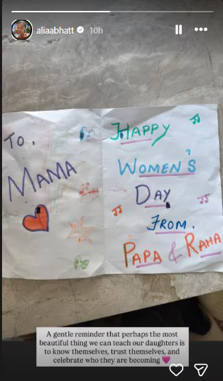 आलिया भट्ट ने एक पोस्ट शेयर कर बताया कि राहा और रणबीर कपूर ने उन्हें वुमेंस डे पर सरप्राइज दिया. आलिया ने इंस्टाग्राम पर एक हाथ से बना हुआ कार्ड शेयर किया, जिसे रणबीर और राहा ने मिलकर उनके लिए बनाया था. इस प्यारे जेस्चर ने फैंस का दिल जीत लिया. कार्ड पर लिखा था, “टू, मामा. हैप्पी वुमेंस डे. फ्रॉम पापा एंड राहा.”