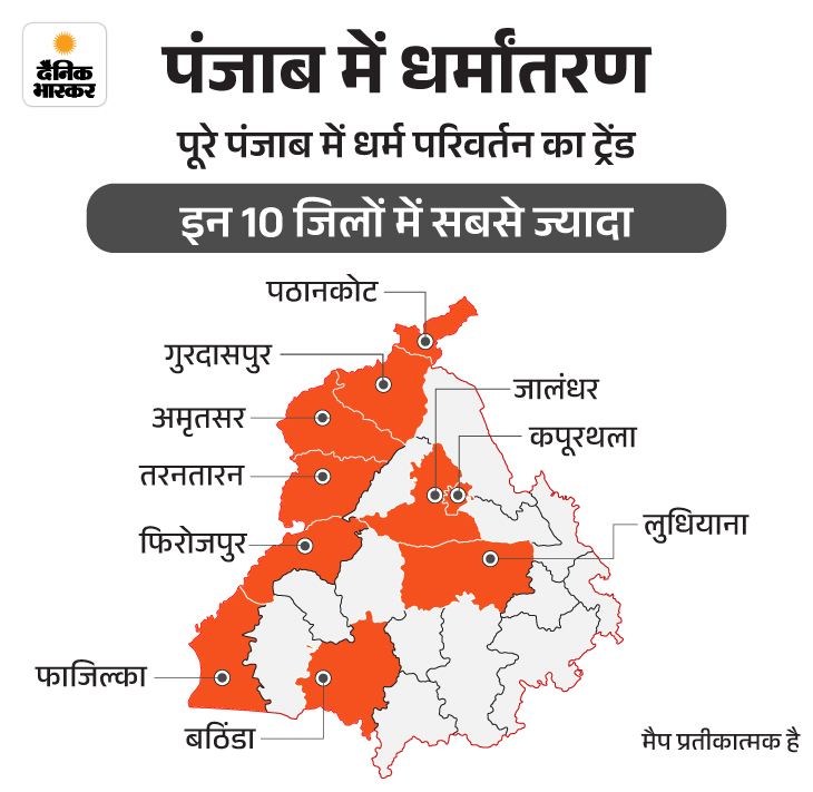 वैसे धर्म परिवर्तन का ट्रेंड पूरे पंजाब में है, लेकिन बार्डर इलाकों में ज्यादा है। इनमें गुरदासपुर के साथ अमृतसर, पठानकोट, फाजिल्का, तरनतारन, फिरोजपुर, लुधियाना, कपूरथला, बठिंडा और जालंधर जिले शामिल हैं।