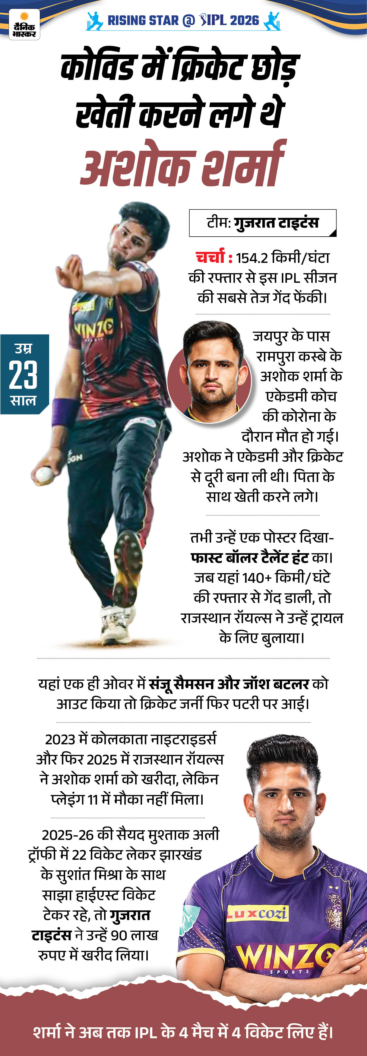 वहां कोच विवेक यादव खूब सपोर्ट करते थे। कोविड-19 में कोच की मौत हो गई तो अशोक ने एकेडमी और क्रिकेट दोनों छोड़ दिए। पिता के साथ खेतों में समय बिताने लगा। उसी अशोक शर्मा ने IPL के इस सीजन की सबसे तेज गेंद फेंकी है। स्पीड- 154.2 किमी/घंटे।