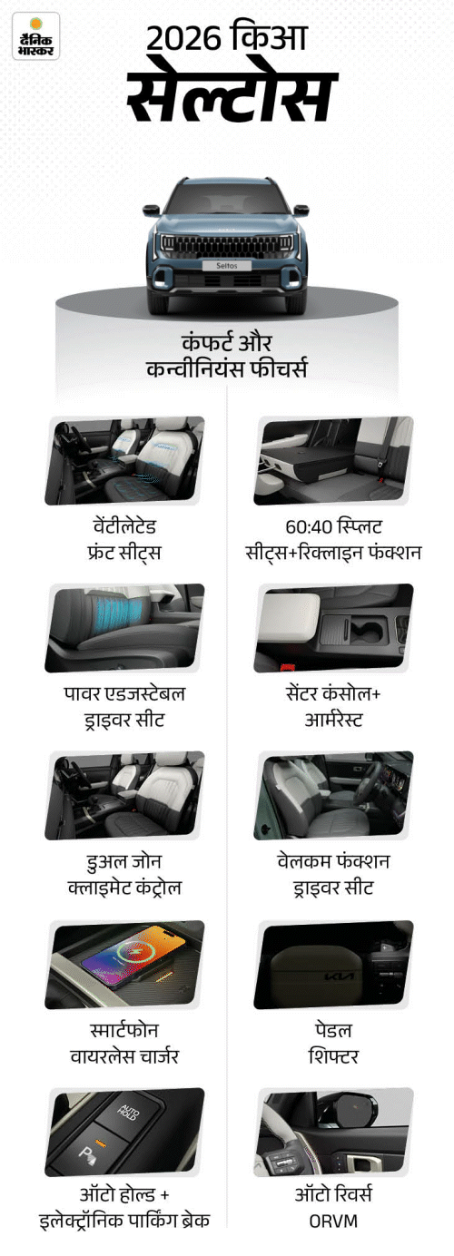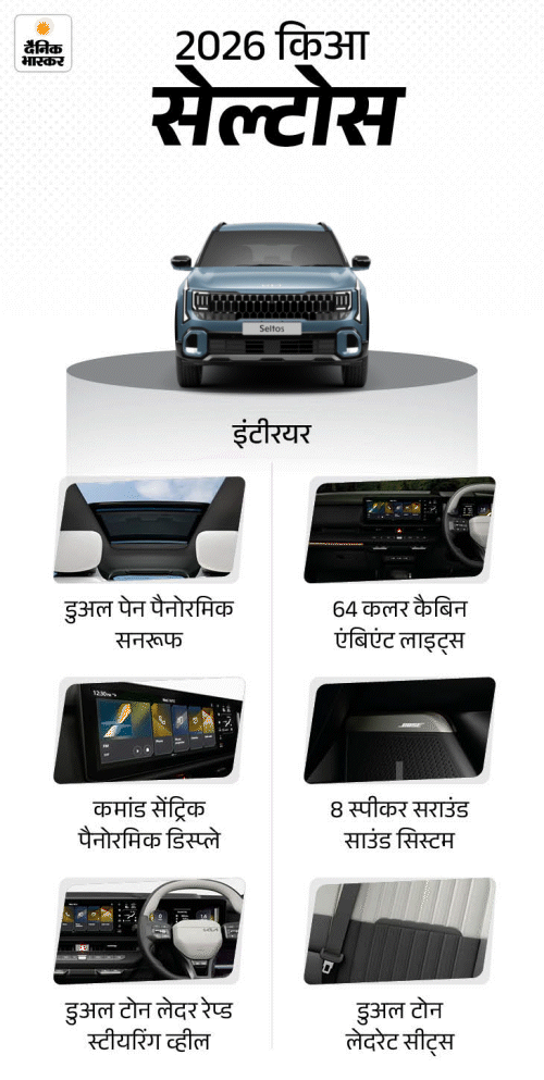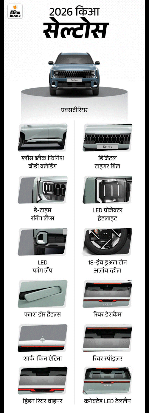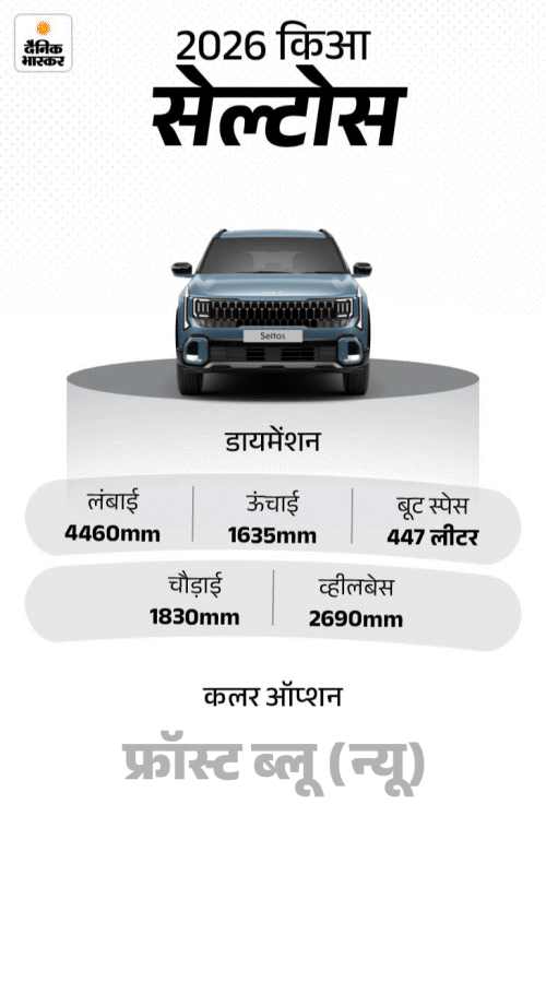 नई 2026 किआ सेल्टोस की बुकिंग शुरू हो चुकी है। आप इसे ऑनलाइन या ऑफलाइन 25,000 रुपए से बुक कर सकते हैं। कार की शुरुआती एक्स-शोरूम कीमत 11.20 लाख रुपए हो सकती है। इसका मुकाबला टाटा सिएरा, हुंडई क्रेटा, मारुति विक्टोरिस, फॉक्सवैगन टाइगन और स्कोडा कुशाक से है।