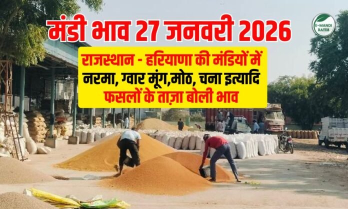 27 January Mandi Bhav: आज मंगलवार को राजस्थान-हरियाणा की मंडियों में ग्वार, चना, सरसों, मूंग और गेहूं के भावों में मिलाजुला रुख देखने को मिला। मंडी समिति के आंकड़ों के मुताबिक आज राजस्थान की रावतसर मंडी में नरमा का सबसे अधिकतम भाव ₹8035 प्रति क्विंटल दर्ज किया। चना के भाव की बात करें तो पिपरिया मंडी (एमपी) में ₹5679 का अधिकतम भाव दर्ज हुआ, जबकि राजस्थान में नोहर और बीकानेर मंडी में चने की कीमतें स्थिर से मजबूत रहीं। वहीं ग्वार में श्रीगंगानगर, गजसिंहपुर और जैतसर मंडी के भाव ₹5500 के पार रहे।