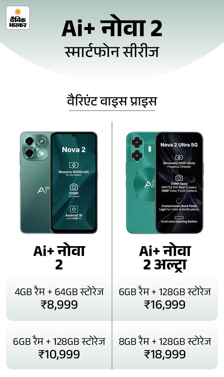 बजट और मिड-रेंज वाले नए फोन्स में बड़ी बैटरी और हाई रिफ्रेश रेट डिस्प्ले है। अल्ट्रा मॉडल में 50MP सोनी कैमरा और 1.5K एमोलेड डिस्प्ले मिलेगा। Ai+ नोवा 2 को 8,999 रुपए की शुरुआती कीमत में पेश किया गया है। वहीं, Ai+ नोवा 2 अल्ट्रा की कीमत 16,999 रुपए से शुरू होती है।