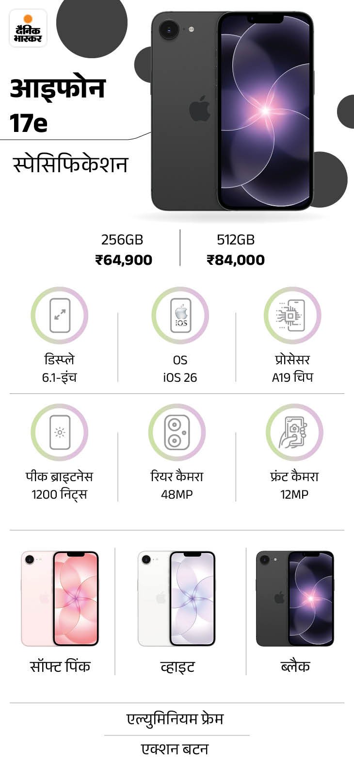 टेक कंपनी एपल ने आज 2 मार्च को भारत सहित ग्लोबल मार्केट में अपनी अपडेटेड 17 सीरीज में सबसे सस्ता फोन आईफोन 17e लॉन्च कर दिया है। आईफोन 16e के मुकाबले इसमें कई अपडेट्स किए गए हैं, जैसे- लेटेस्ट A19 चिप-सेट, 48MP फ्यूजन कैमरा, बेहतर मजबूती, मैग्सेफ सपोर्ट और बेस वैरिएंट में स्टोरेज को दोगुना यानी 256GB कर दिया गया है।