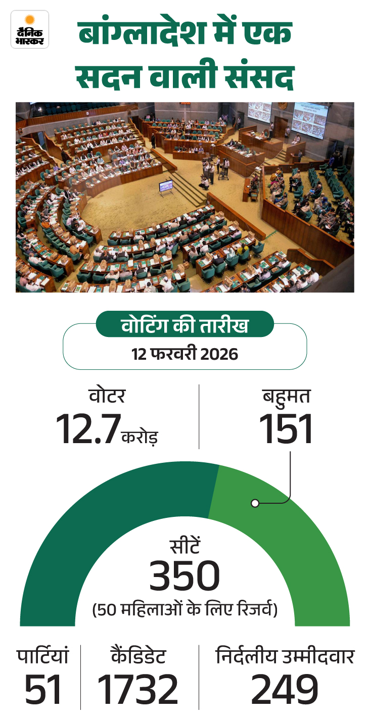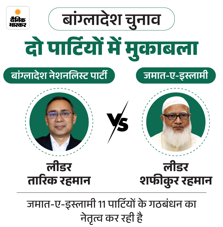 इस बार चुनाव में सिर्फ दो धड़े हैं। बांग्लादेश नेशनलिस्ट पार्टी, जिसके नेता खालिदा जिया के बेटे तारिक रहमान हैं। दूसरा जमात-ए-इस्लामी, जिसने 11 पार्टियों का गठबंधन बनाया है। जमात के नेता शफीकुर रहमान हैं। पूर्व PM शेख हसीना के खिलाफ आंदोलन करने वाले छात्रों की पार्टी नेशनल सिटिजन पार्टी ने भी जमात के साथ हाथ मिला लिया है।