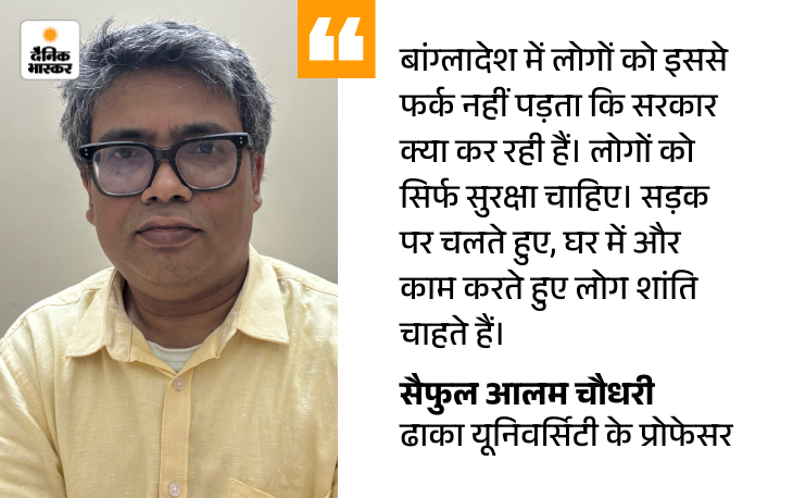 एक्सपर्ट बोले- लोगों को सुरक्षा से मतलब, सरकार से नहीं ढाका यूनिवर्सिटी के प्रोफेसर सैफुल आलम चौधरी कहते हैं, ‘जिन हालात में बांग्लादेश में चुनाव हो रहे हैं, उसमें सबसे बड़ा सवाल है कि चुनाव होंगे या नहीं। अगर आप लोगों से बात करेंगे तो ज्यादातर कहेंगे कि चुनाव तो होगा, लेकिन नतीजे आएंगे या नहीं, इस पर शक है। अभी बांग्लादेश का अजीब माहौल है। अवामी लीग पर बैन लगा है। वह चुनाव में हिस्सा नहीं ले रही है। सरकार चुनाव की बजाय रेफरेंडम पर जोर दे रही है।’