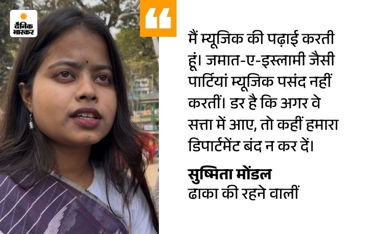 हिंदू वोटर्स की राय- पहले ज्यादा सेफ थे, समझ नहीं आ रहा किसे वोट दें ढाका की जगन्नाथ यूनिवर्सिटी में पढ़ने वाली सुष्मिता मोंडल म्यूजिक डिपार्टमेंट में सेकेंड ईयर की स्टूडेंट हैं। वे अपने दोस्तों के साथ शहीद मीनार आई थीं। चुनाव और अल्पसंख्यकों के हालात पर सुष्मिता कहती हैं, ‘बीच-बीच में दिक्कतें आती रहती हैं। सड़क पर लोग गलत इशारे करते हैं। टोकने पर बदतमीजी करने लगते हैं।’
