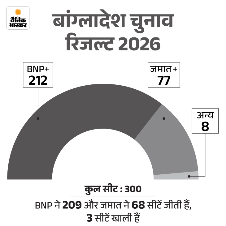 बांग्लादेश में 12 फरवरी को हुए चुनाव में BNP यानी बांग्लादेश नेशनलिस्ट पार्टी के गठबंधन ने 299 में से 212 सीटें जीती हैं। सरकार बनाने के लिए 150 सीटों की जरूरत थी। कट्टरपंथी पार्टी जमात-ए-इस्लामी के गठबंधन को सिर्फ 77 सीटें मिलीं हैं। शेख हसीना की सरकार गिराने वाले स्टूडेंट्स की पार्टी नेशनल सिटीजन पार्टी यानी NCP को भी बांग्लादेशियों ने नकार दिया। पार्टी सिर्फ 6 सीटें जीत पाई है। पढ़िए पूरी खबर…