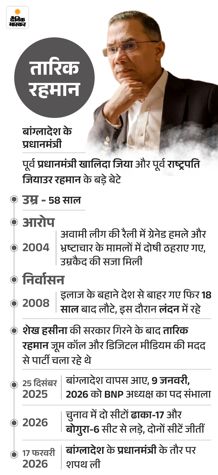 सवाल: आप नए प्रधानमंत्री तारिक रहमान के काफी करीब हैं, उनकी खूबियां क्या हैं? जवाब: वे काफी खुले विचारों के हैं। दूसरे लोगों को सुनना पसंद करते हैं। नए विचारों के लिए खुली सोच रखते हैं। उनकी उम्र करीब 60 साल है, लेकिन उन्हें देखकर नहीं लगता। कई लोग उन्हें युवाओं का लीडर भी कहते हैं।