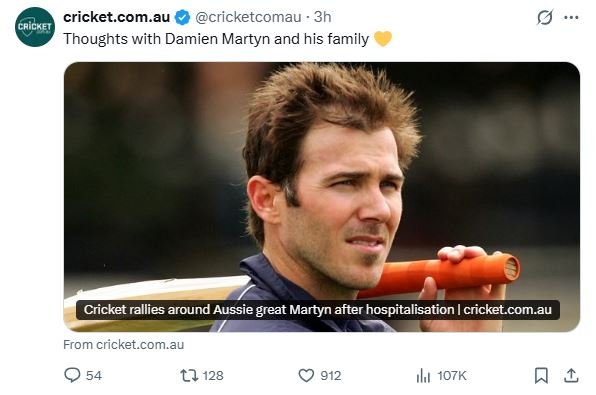 पूर्व ऑस्ट्रेलियाई क्रिकेटर डेमियन मार्टिन को मेनिन्जाइटिस (मस्तिष्क झिल्ली में सूजन) के कारण अस्पताल में भर्ती कराया गया है और वे उन्हें इंड्यूस्ड कोमा में रखा गया है। उनका ब्रिस्बेन के एक अस्पताल में इलाज चल रहा है, जहां उनकी हालत गंभीर बनी हुई है।