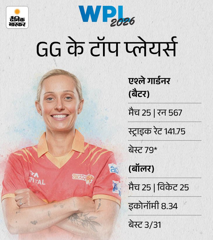 गार्डनर गुजरात जायंट्स की सबसे बड़ी ताकत विमेंस प्रीमियर लीग में गुजरात जायंट्स की सबसे बड़ी ताकत एश्ले गार्डनर रही हैं। बल्लेबाजी में गार्डनर ने 25 मैचों में 567 रन बनाए हैं, जिसमें उनका सर्वश्रेष्ठ स्कोर नाबाद 79 रन रहा है। 141.75 के शानदार स्ट्राइक रेट के साथ उन्होंने कई मौकों पर टीम को तेज रन दिए हैं। वहीं गेंदबाजी में भी गार्डनर ने अहम योगदान दिया है। उन्होंने 25 मैचों में 25 विकेट लिए हैं और उनका बेस्ट प्रदर्शन 3 विकेट 31 रन देकर रहा है। 8.34 की इकॉनमी के साथ गार्डनर गुजरात के लिए एक अहम ऑलराउंडर साबित हुई हैं।