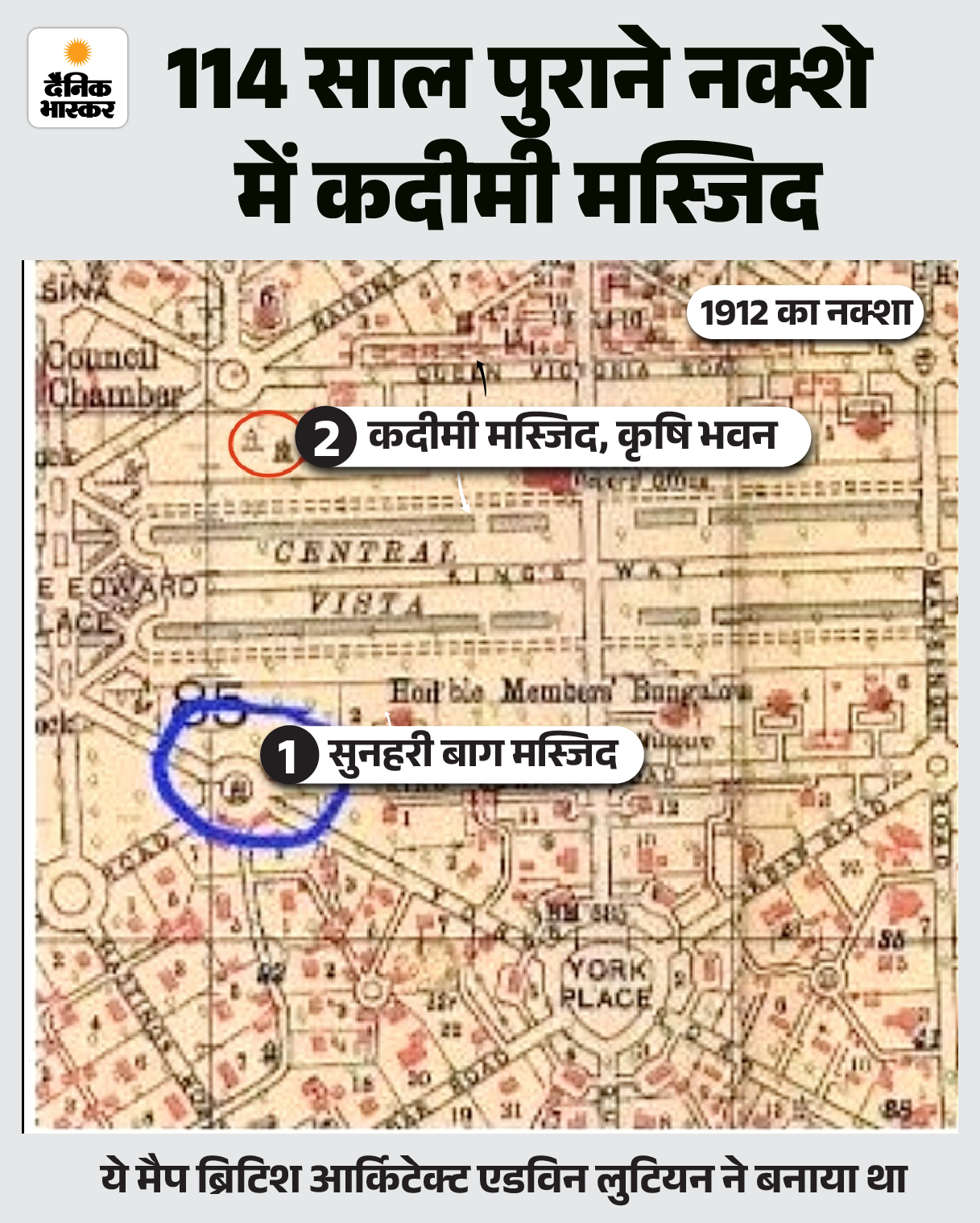एडवोकेट मशरूर 1912 में एडविन लुटियन का बनाया नक्शा दिखाते हैं। इसमें दो सर्किल जरिए कहते हैं, ‘बड़े सर्किल में सुनहरी मस्जिद है। इसे भी तोड़ा जाना था, लेकिन हमने इसे बचा लिया। हमें सही वक्त पर उसे गिराए जाने की सूचना मिल गई थी। हम कोर्ट चले गए और कोर्ट ने हमारे पक्ष में फैसला दिया। दूसरे छोटे सर्किल में कदीमी मस्जिद है। ये नक्शा सबूत है कि ये दोनों मस्जिदें 1912 से पहले की हैं।’