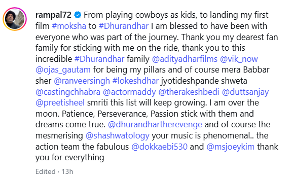 He further wrote, ‘Thank you to this wonderful team of Dhurandhar, you all have been my strong support. And my “Babbar Sher” Ranveer Singh, special thanks to you. Lokendra Dhar, Jyoti Deshpande, Shweta, Casting Team, R. Madhavan, Rakesh Bedi, Sanjay Dutt, Preeti Sheel, Smriti, thanks to all of you. This list will be longer. I am very happy. If you persist with patience, hard work and passion, dreams come true.