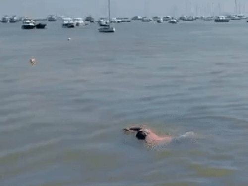 अरब सागर में स्विमिंग करते हुए फतेहाबाद के अंतरराष्ट्रीय दिव्यांग तैराक सुरेंद्र ढाका।