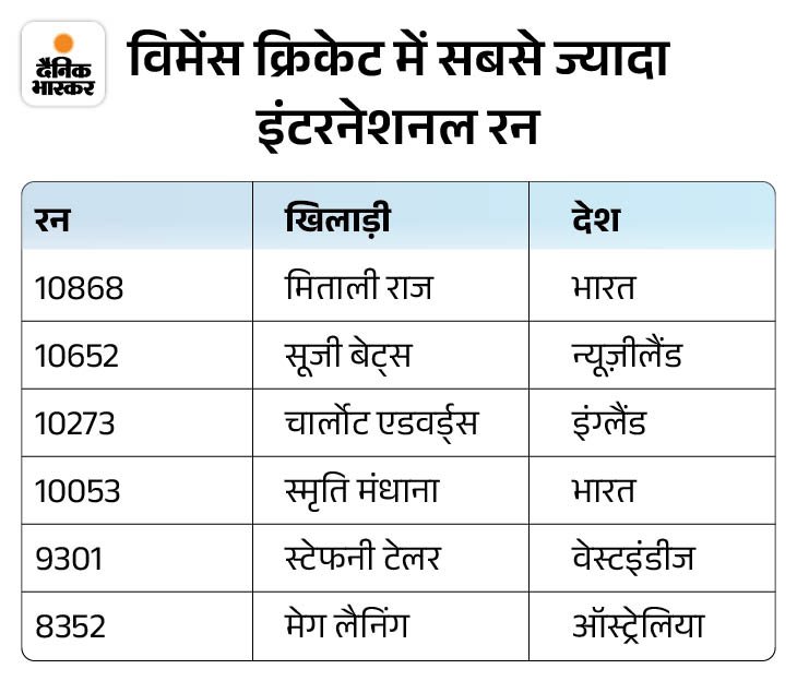4. मंधाना के 10 हजार इंटरनेशनल रन पूरे विमेंस क्रिकेट में स्मृति मंधाना 10 हजार इंटरनेशनल रन पूरे करने वाली चौथी महिला बल्लेबाज बन गई हैं। सबसे ऊपर मिताली राज हैं, जिन्होंने भारत के लिए 10,868 रन बनाए हैं। उनके बाद न्यूजीलैंड की सूजी बेट्स (10,652 रन) और इंग्लैंड की चार्लोट एडवर्ड्स (10,273 रन) का नाम आता है।