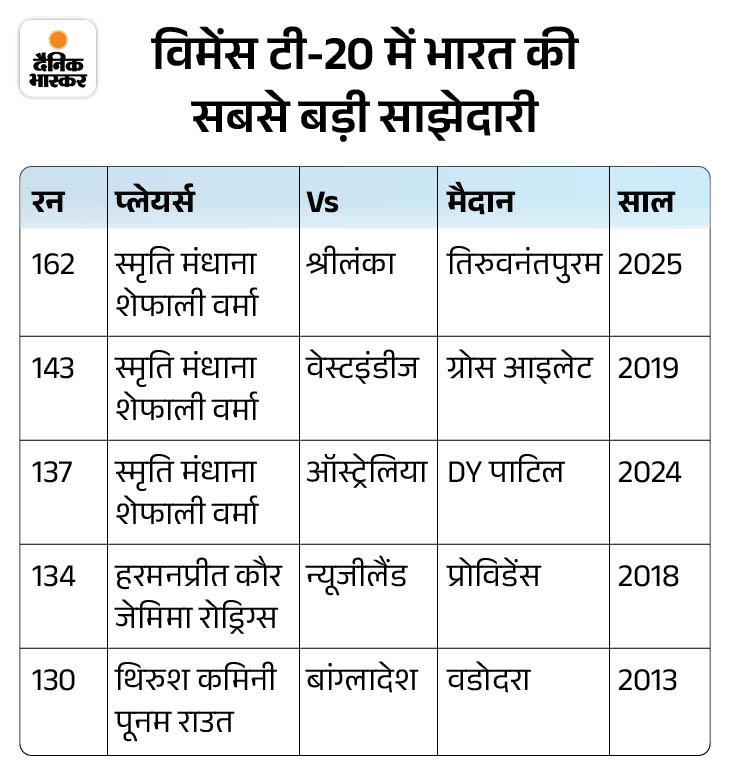 6. मंधाना-शेफाली ने हाईएस्ट पार्टनरशिप की विमेंस टी-20 में भारत की सबसे बड़ी साझेदारी का रिकॉर्ड शेफाली वर्मा और स्मृति मंधाना की जोड़ी के नाम है। दोनों ने चौथे टी-20 में श्रीलंका के खिलाफ 162 रन की रिकॉर्ड साझेदारी की। इससे पहले 2019 में वेस्टइंडीज के खिलाफ ग्रोस आइलेट में दोनों ने 143 रन जोड़े थे, जबकि 2024 में ऑस्ट्रेलिया के खिलाफ DY पाटिल स्टेडियम में 137 रन की साझेदारी की थी।