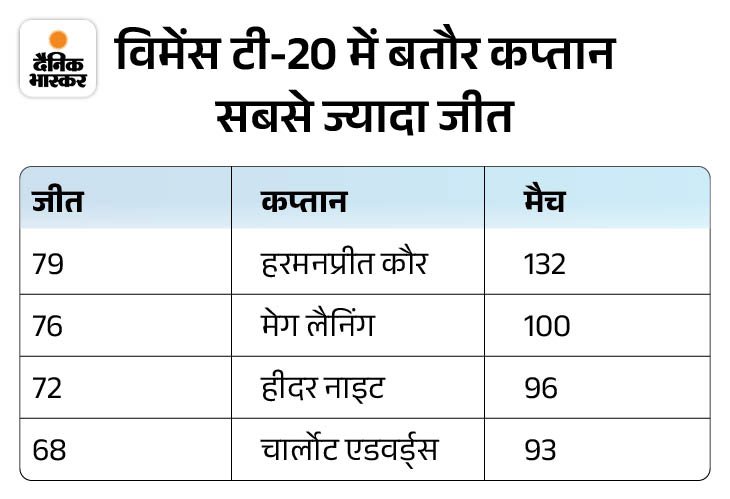 3. हरमनप्रीत बतौर कप्तान सबसे ज्यादा मैच जीतने वाली महिला विमेंस टी-20 में बतौर कप्तान सबसे ज्यादा जीत का रिकॉर्ड हरमनप्रीत कौर के नाम है। उन्होंने 133 मैचों में कप्तानी करते हुए 79 मुकाबले जिताए हैं। दूसरे नंबर पर ऑस्ट्रेलिया की मेग लैनिंग हैं, जिन्होंने 100 मैचों में 76 जीत दर्ज कीं, जबकि इंग्लैंड की हीदर नाइट ने 96 मैचों में 72 जीत हासिल की हैं।