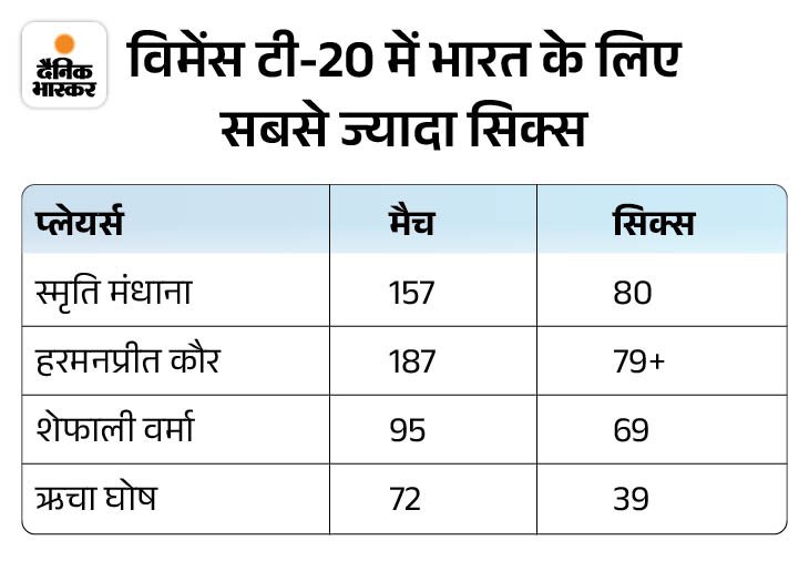 5. मंधाना ने भारतीय विमेंस के लिए सबसे ज्यादा सिक्स लगाए विमेंस टी-20 में भारत के लिए सबसे ज्यादा छक्के लगाने का रिकॉर्ड स्मृति मंधाना के नाम है। मंधाना अब तक 157 मैचों में 80 छक्के लगा चुकीं हैं। इस मामले में भारतीय टीम की कप्तान हरमनप्रीत कौर दूसरे नंबर पर हैं, जिन्होंने 187 मैचों में 79 से ज्यादा छक्के लगाए हैं।