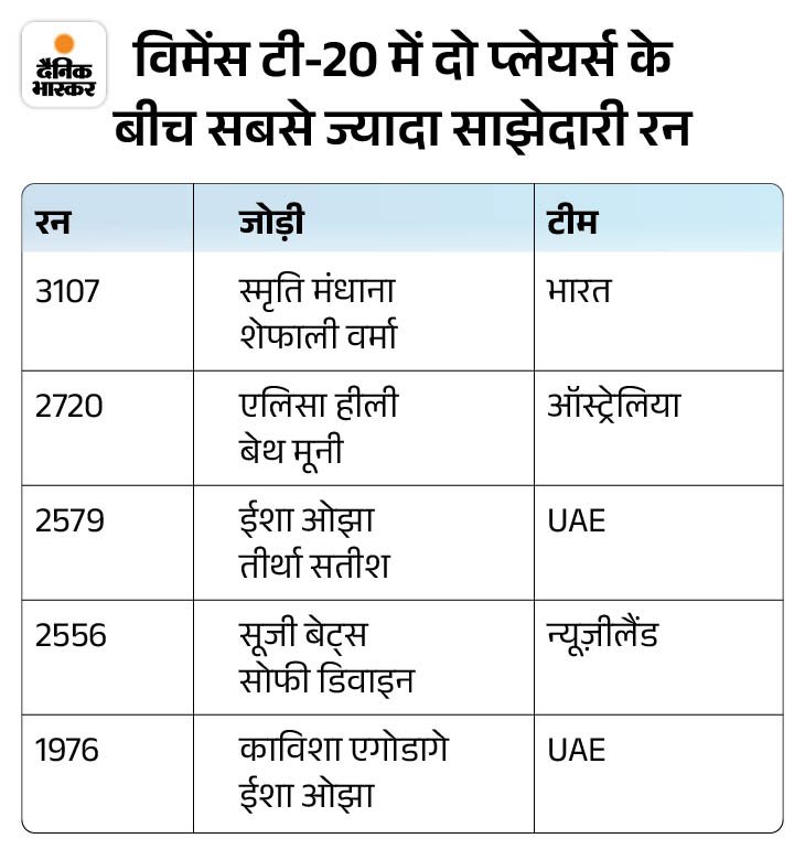 7. मंधाना-शेफाली के नाम सबसे ज्यादा साझेदारी रन स्मृति मंधाना और शेफाली वर्मा ने साथ मिलकर अब तक 3107 रन जोड़े हैं। यह विमेंस टी-20 इंटरनेशनल में दो खिलाड़ियों के बीच सबसे ज्यादा साझेदारी रन बनाने का रिकॉर्ड हैं। दूसरे नंबर पर ऑस्ट्रेलिया की एलिसा हीली और बेथ मूनी की जोड़ी है, जिन्होंने 2720 रन जोड़े हैं।