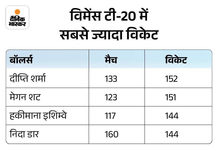 2. दीप्ति सबसे ज्यादा विकेट लेने वाली बॉलर दीप्ति शर्मा विमेंस टी-20 में सबसे ज्यादा विकेट लेने वाली गेंदबाज बन गई हैं। उनके नाम अब 133 मैचों में 152 विकेट हो गए हैं। दूसरे नंबर पर ऑस्ट्रेलिया की मेगन शट हैं, जिन्होंने 123 मैचों में 151 विकेट लिए हैं।