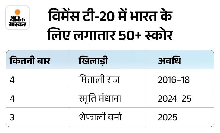 8. शेफाली ने सीरीज में लगातार तीन फिफ्टी लगाई श्रीलंका के खिलाफ सीरीज में शेफाली वर्मा ने लगातार तीन अर्धशतक जड़े। विमेंस टी-20 में भारत के लिए लगातार 50+ स्कोर बनाने वालों की सूची में मिताली राज और स्मृति मंधाना संयुक्त रूप से टॉप पर हैं, जिन्होंने लगातार चार-चार बार 50+ स्कोर बनाए थे। वहीं शेफाली ने लगातार तीन फिफ्टी लगाकर इस खास क्लब में एंट्री की।