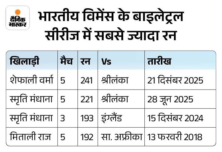 इस लिस्ट में दूसरे नंबर पर स्मृति मंधाना हैं, जिन्होंने 2025 में श्रीलंका के खिलाफ 5 मैचों में 221 रन बनाए थे। मंधाना ने इससे पहले 2024 में इंग्लैंड दौरे पर 3 मैचों की सीरीज में 193 रन भी जोड़े थे। वहीं पूर्व कप्तान मिताली राज ने 2018 में दक्षिण अफ्रीका के खिलाफ 5 मैचों की सीरीज में 192 रन बनाए थे।