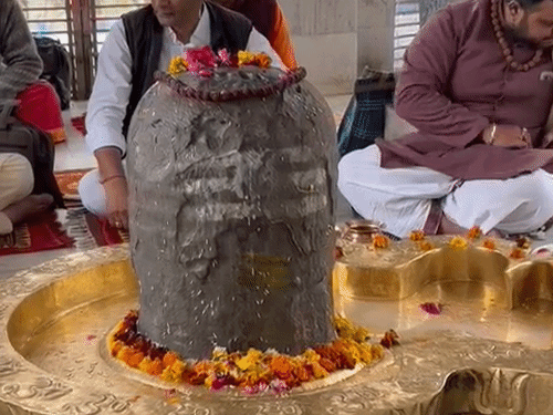 नीलेश्वर महादेव के मंदिर में शिवलिंग पर दूध और दही अर्पित करते हनी सिंह।