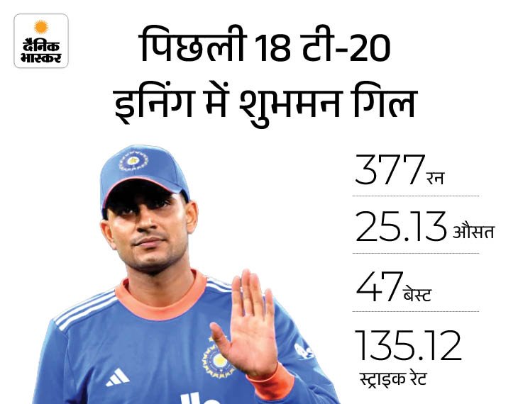 सवाल- क्या अपनी जगह बचा पाएंगे गिल? जवाब- भारतीय टीम के उपकप्तान शुभमन गिल इस समय आउट ऑफ फॉर्म चल रहे हैं। वे करीब डेढ़ साल और पिछली 18 पारियों से टी-20 में कोई अर्धशतक नहीं लगा सके हैं। इसके बावजूद उनका चयन लगभग तय माना जा रहा है।