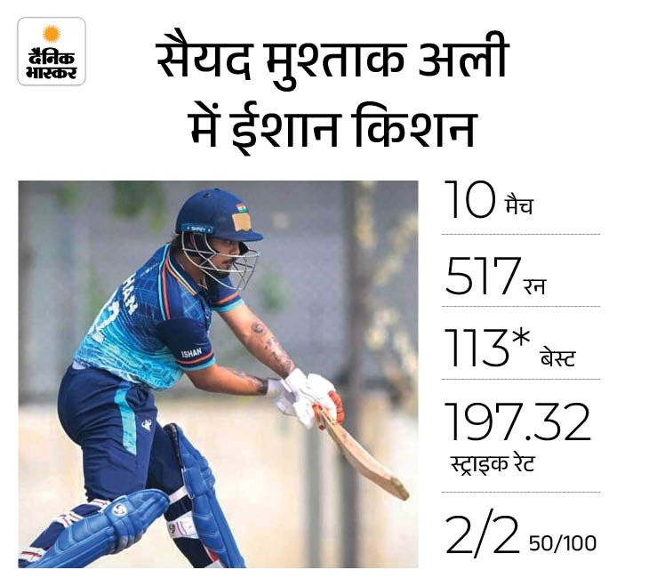 सवाल- क्या ईशान किशन वापसी करेंगे? जवाब- विकेटकीपर बल्लेबाज ईशान किशन ने सैयद मुश्ताक अली ट्रॉफी में शानदार प्रदर्शन किया है। उन्होंने पुणे में खेले गए फाइनल में 49 गेंदों पर 101 रन की पारी खेलकर झारखंड को पहली बार चैंपियन बनाया। ईशान मौजूदा सीजन में मुश्ताक अली ट्रॉफी के टॉप स्कोरर रहे, जहां उन्होंने 10 मैचों में 197.32 के स्ट्राइक रेट से 517 रन बनाए। इस दौरान उनके बल्ले से 2 शतक और 2 अर्धशतक निकले।