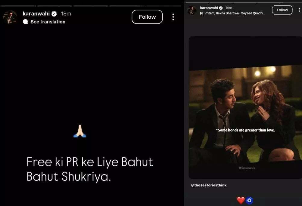 After reports surfaced of Karan Wahi and Jennifer Winget’s alleged marriage plans, he took to social media to clarify the rumours. Setting the record straight, the Hate Story 4 actor wrote on his Instagram Stories that he was glad to receive “Free ki PR.” In another Story, Karan shared a shot from Yeh Jawaani Hai Deewani, featuring besties ‘Bunny’ (Rabir Kapoor) and ‘Aditi’ (Kalki Koechlin). Fans saw it as Karan’s way of confirming that he and Jennifer were just friends. He also told Hindustan Times that it’s “fake news” and told SCREEN, “Don’t know where this came from, but it’s not true.” Karan’s IG posts were captioned as: