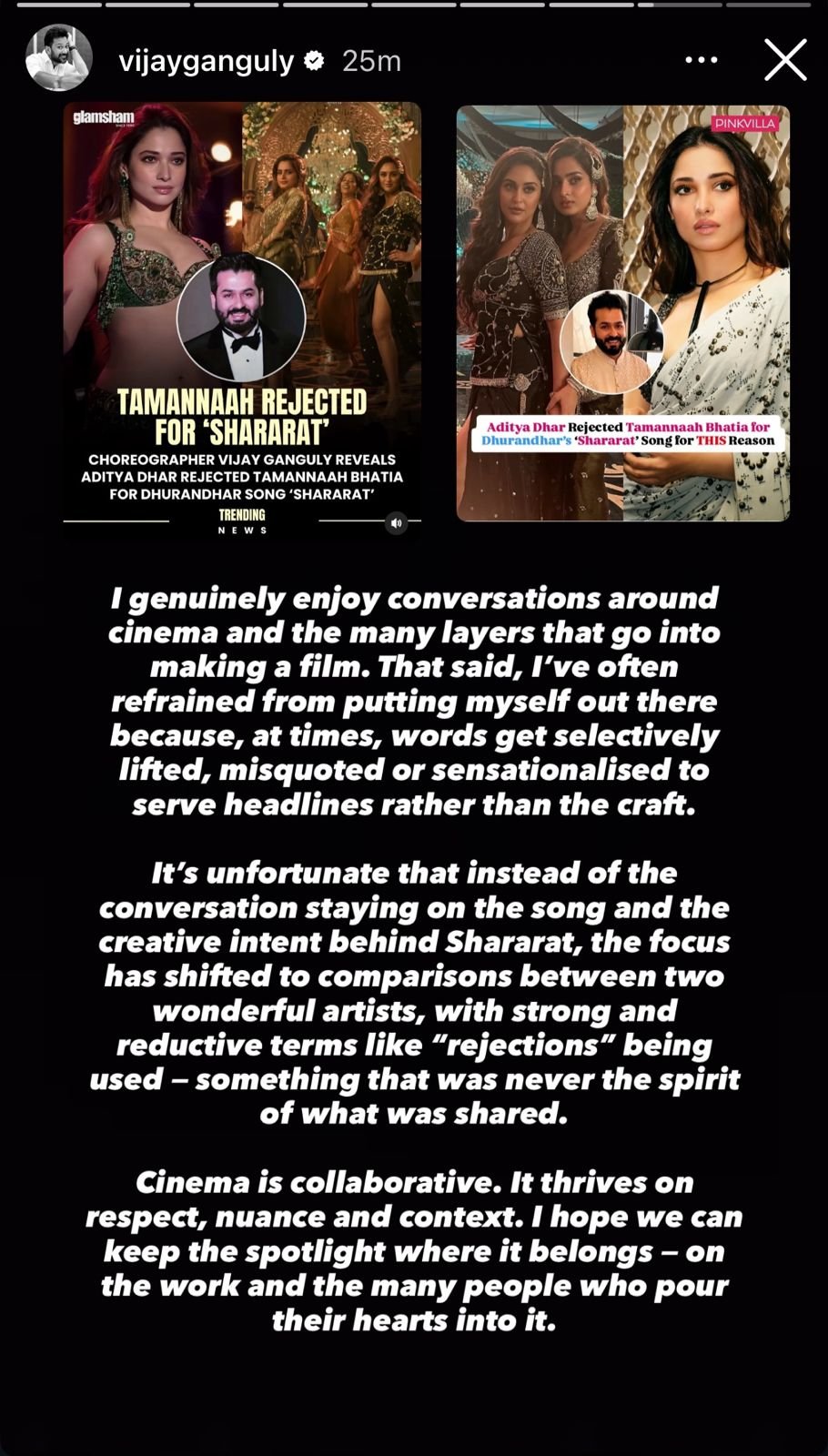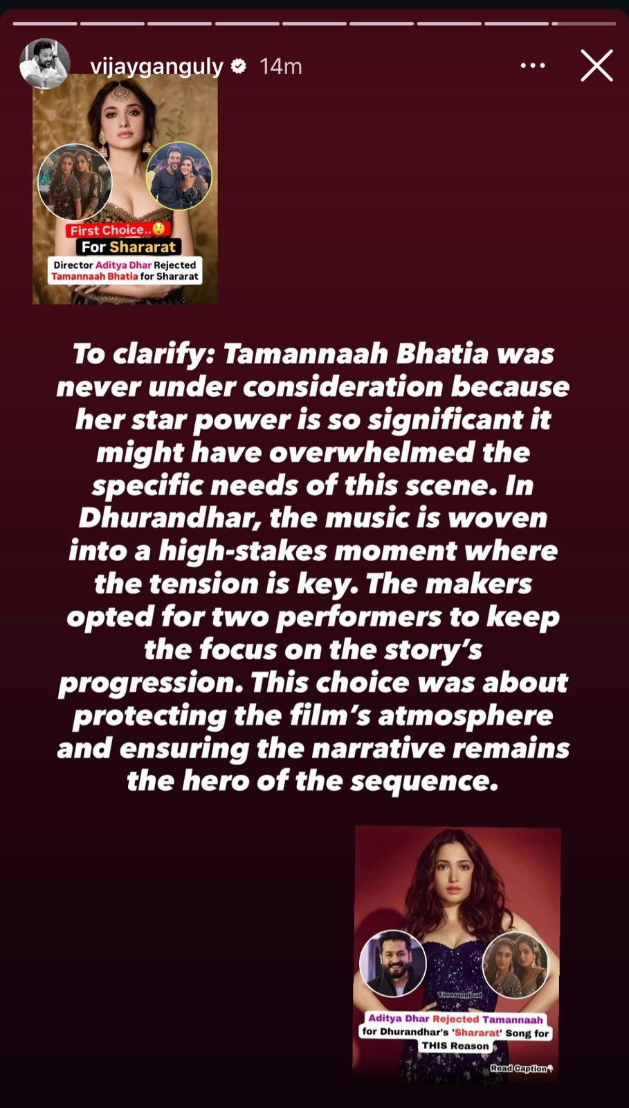 धुरंधर रिलीज के बाद फिल्म के कोरियोग्राफर विजय गांगुली ने एक इंटरव्यू में कहा था कि वो पहले तमन्ना के साथ गाना फिल्माना चाहते थे, लेकिन डायरेक्टर आदित्य धर ने इससे इनकार कर दिया। इसके बाद से ही खबरें आने लगीं कि तमन्ना को गाने से हटा दिया गया था। हालांकि बाद में कोरियोग्राफर ने साफ किया कि तमन्ना के नाम पर सिर्फ विचार किया गया था, उन्हें ये गाना कभी ऑफर नहीं हुआ। उन्होंने सोशल मीडिया पर अपने बयान पर सफाई दी थी।