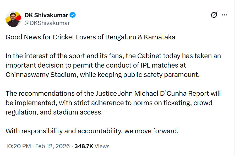 शिवकुमार ने X पर पोस्ट करते हुए लिखा , बेगंलुरु और कर्नाटक के क्रिकेट प्रेमियों के लिए अच्छी खबर हैं। खेल और उसके प्रशंसकों के हित में कैबिनेट ने चिन्नास्वामी स्टेडियम में IPL मैचों की अनुमति देने का फैसला लिया है।