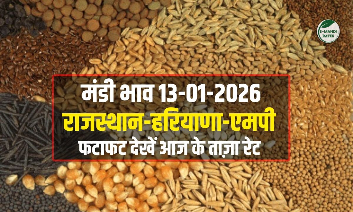 Mandi Bhav Today: 13 जनवरी 2026 को विभिन्न मंडियों में दाल-तिलहन की कीमतों में बड़ा अंतर देखने को मिला। मूंग का टॉप भाव रायसिंहनगर मंडी में ₹8825, नरमा का उच्चतम भाव सिरसा में ₹8105 और चना का सर्वोच्च भाव पिपरिया मंडी में ₹5684 दर्ज हुआ। गेहूं में भी मजबूती दिखी, जहां पिपरिया में ₹2778 का उच्च स्तर रहा।