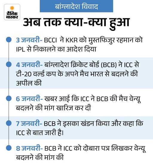 BCB ने दूसरी बार वेन्यू बदलने की मांग की BCB ने 5 दिन में दूसरी बार ICC से अपने मैचों के वेन्यू बदलने की मांग की है। उसने खेल मंत्रालय के सलाहकार आसिफ नजरुल के साथ चर्चा के बाद दूसरी बार लेटर लिखा। इसमें BCB ने ICC को सुरक्षा से जुड़ी चिंताओं का पूरा ब्योरा दिया है। बांग्लादेशी बोर्ड ने 4 जनवरी को पहला पत्र लिखा था।