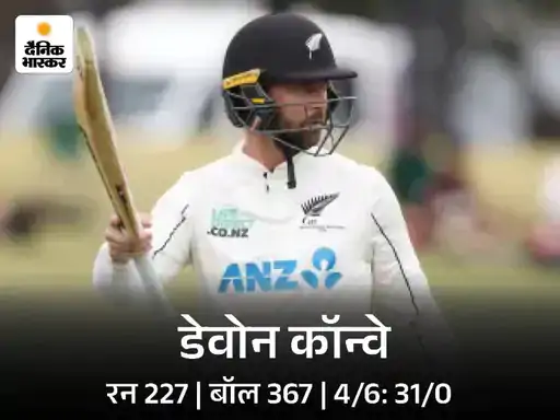 कॉन्वे का दूसरी पारी में भी शतक डेवोन कॉन्वे ने इस टेस्ट मैच में कुल 327 रन बनाए। पहली पारी में उन्होंने 367 गेंदों पर 227 रन बनाए, जिसमें 31 चौके शामिल थे। दूसरी पारी में कॉन्वे ने 139 गेंदों पर 100 रन की पारी खेली, जिसमें 3 छक्के और 8 चौके लगाए। यह उनके टेस्ट करियर का सातवां शतक है।कॉन्वे 95 साल के टेस्ट इतिहास में न्यूजीलैंड के पहले बल्लेबाज बने, जिन्होंने एक ही मैच में दोहरा शतक और शतक लगाया। दुनिया में ऐसा करने वाले वे 10वें बल्लेबाज हैं।
