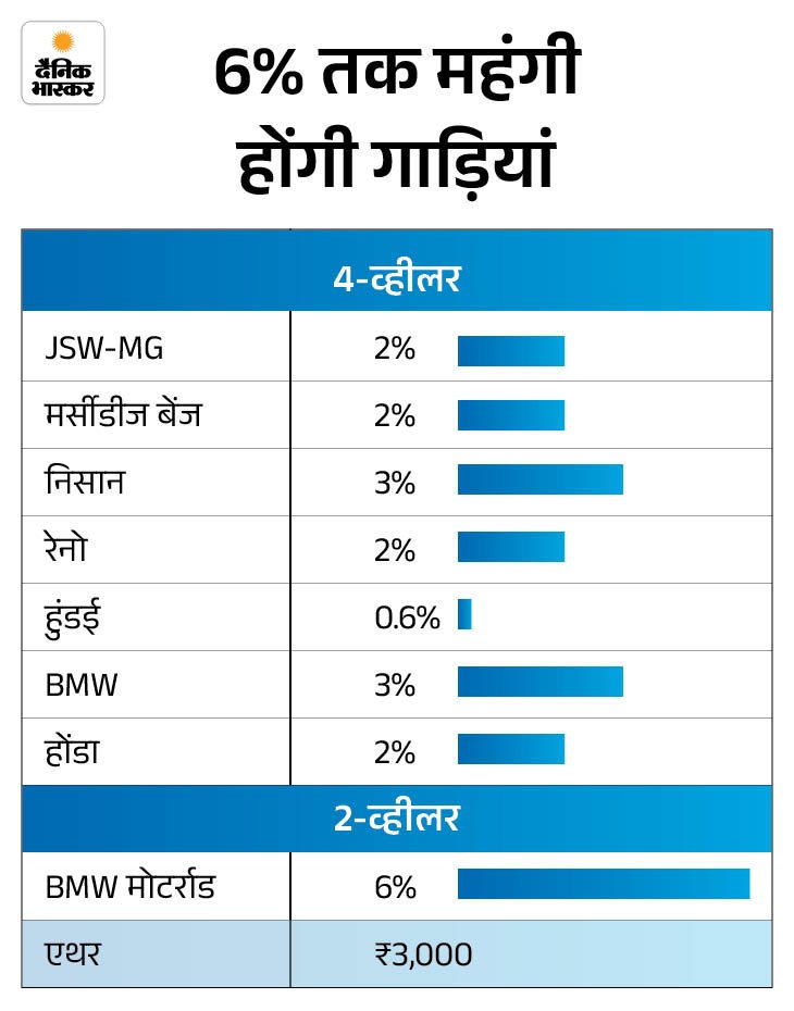 नए साल की शुरुआत के साथ ऑटोमोबाइल कंपनियों ने अपनी गाड़ियों के दाम बढ़ा दिए हैं। इनमें हुंडई, मर्सीडीज बेंज, JSW-MG, निसान, रेनो, BYD, होंडा, BMW, एथर और BMW मोटर्राड शामिल हैं।