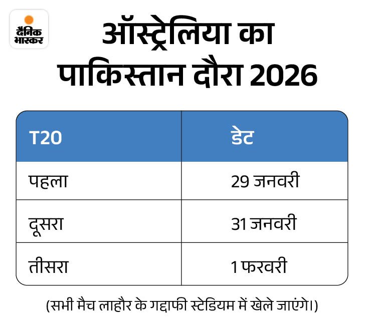 28 जनवरी को पाकिस्तान पहुंचेगी कंगारू टीम ऑस्ट्रेलियाई टीम 28 जनवरी को पाकिस्तान पहुंचेगी। पाकिस्तानी सरजमीं पर यह ऑस्ट्रेलिया की दूसरी T20 सीरीज होगी। इससे पहले अप्रैल 2022 में सिर्फ एक T20 इंटरनेशनल मैच खेला गया था।