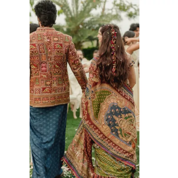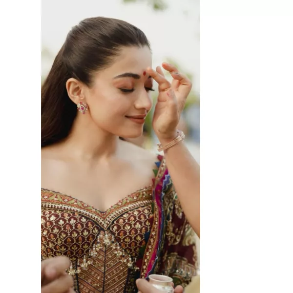 “The designer reworked into something lighter and more contemporary. Rashmika’s outfit came together after exploring several routes, from lehengas to draped sarees, before settling on a bejewelled corset paired with a draped dhoti skirt and an odhna dupatta. The most striking detail is the dupatta, illustrated with a depiction of Devi Lakshmi set within a temple arch, inspired by Tanjore devotional art.”