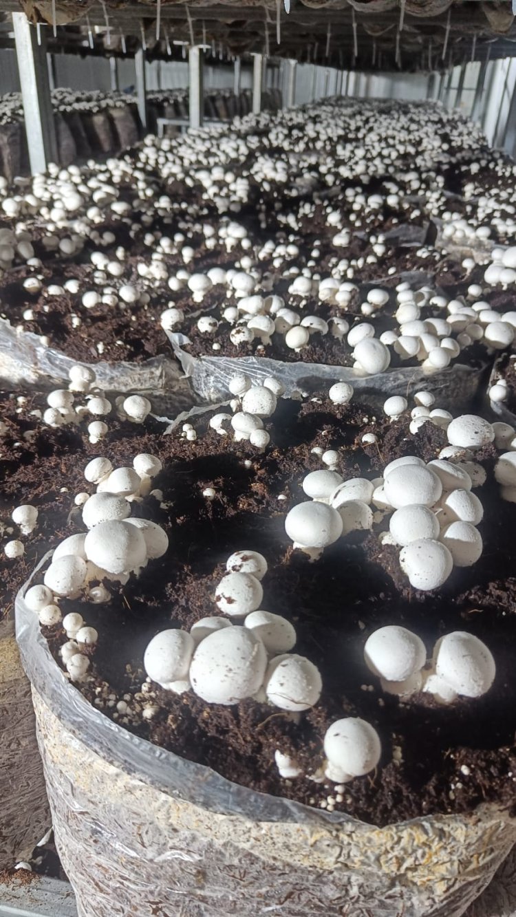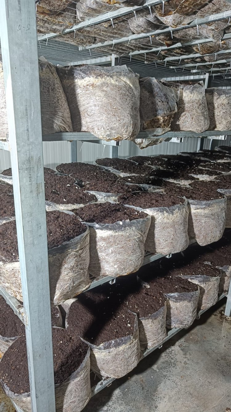 Shivam currently grows mushrooms in one room using 16 tonnes of compost and reports yields of 3,000–3,500 tonnes per crop cycle. Each cultivation cycle typically lasts 45–50 days.