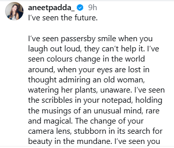 आगे अनीत लिखती हैं, ‘मैंने तुम्हारी नोटबुक के उन बेतरतीब स्केचों को देखा है, जिनमें एक अनोखे, दुर्लभ और जादुई दिमाग की सोच कैद है। मैंने तुम्हारे कैमरे का लेंस बदलते देखा है, जो आम-सी चीजों में भी खूबसूरती ढूंढने पर अड़ा रहता है। मैंने तुम्हें बेहद निस्वार्थ होते देखा है।’