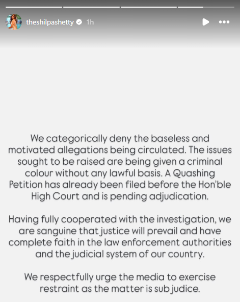 शिल्पा शेट्टी ने भी यह बयान अपनी इंस्टाग्राम स्टोरी पर शेयर किया था।