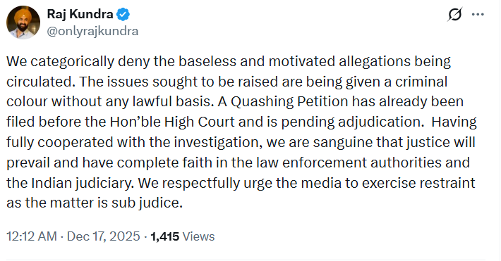 राज कुंद्रा ने सोशल मीडिया प्लेटफॉर्म X पर अपने बयान में कहा था, “हम अपने खिलाफ फैलाए जा रहे बेबुनियाद और दुर्भावनापूर्ण आरोपों को पूरी तरह नकारते हैं। जिन बातों को उठाया जा रहा है, उन्हें बिना किसी कानूनी आधार के आपराधिक रंग दिया जा रहा है। हाई कोर्ट में क्वैशिंग पिटीशन दाखिल की जा चुकी है और उस पर सुनवाई बाकी है।”