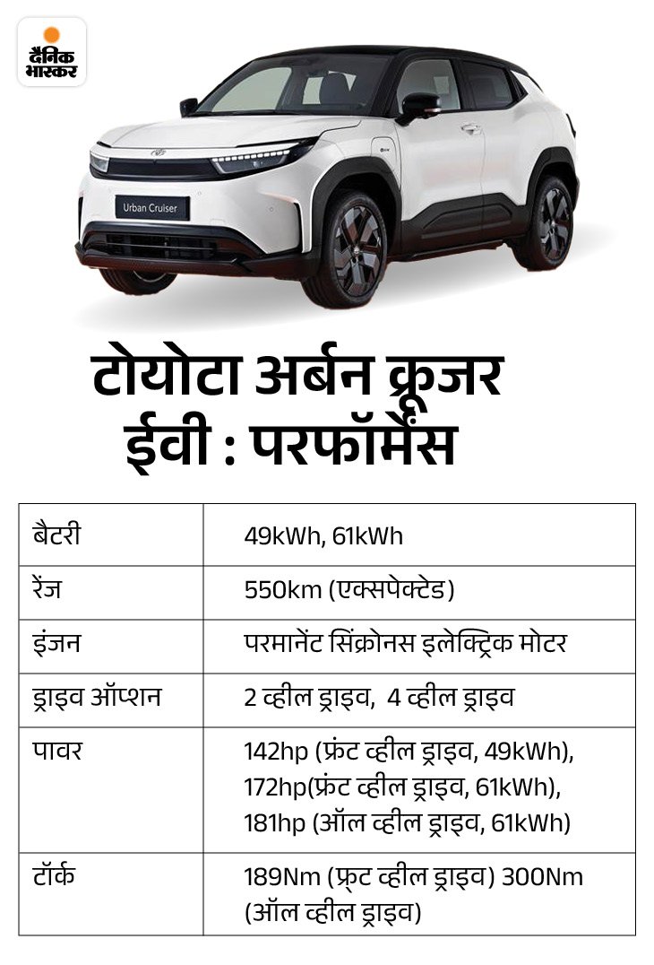 यूरोपियन मार्केट में टोयोटा अर्बन क्रूजर ईवी को ई-विटारा की तरह दो बैटरी पैक ऑप्शन के साथ पेश किया गया है। इसमें 49kWh और 61kWh का बैटरी पैक ऑप्शन शामिल है।