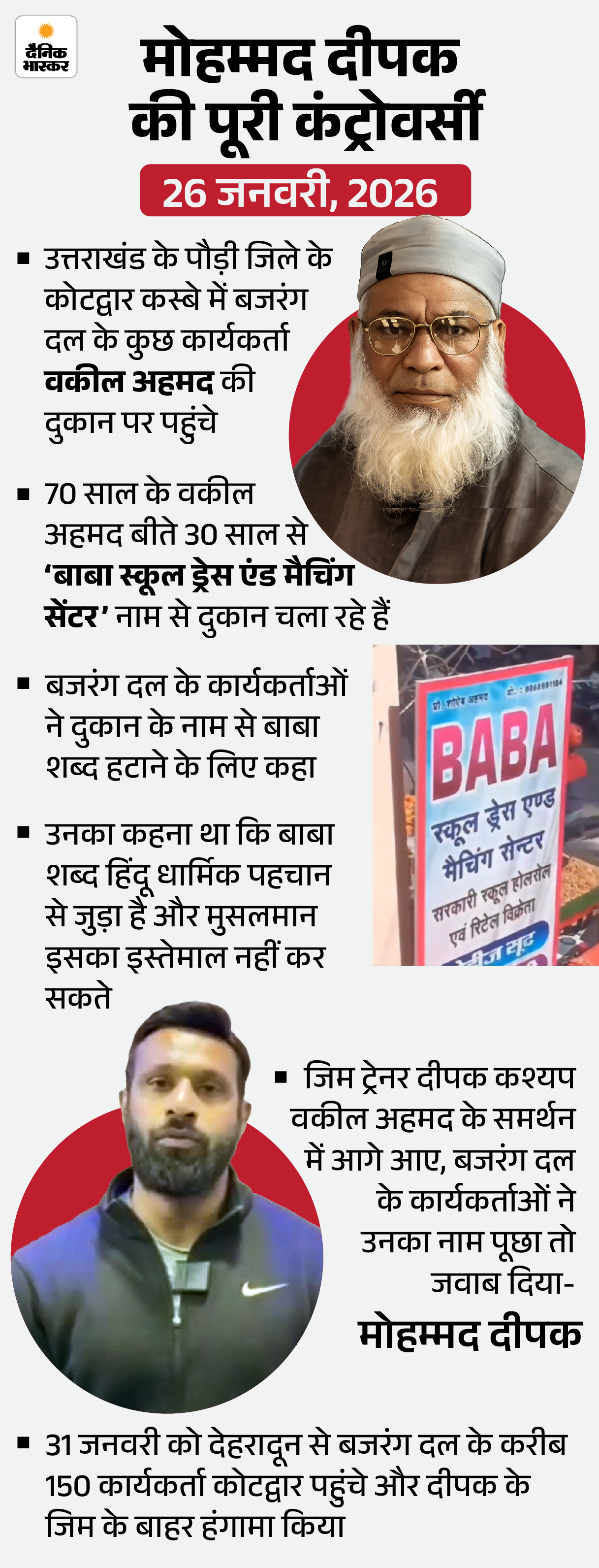 कोटद्वार में पटेल मार्ग पर बाबा स्कूल ड्रेस नाम की दुकान है। ये दुकान 70 साल के वकील अहमद की है। बजरंग दल के कार्यकर्ताओं को दुकान के नाम पर आपत्ति थी। वकील अहमद ने कहा था कि वे दुकान का नाम बदल लेंगे।