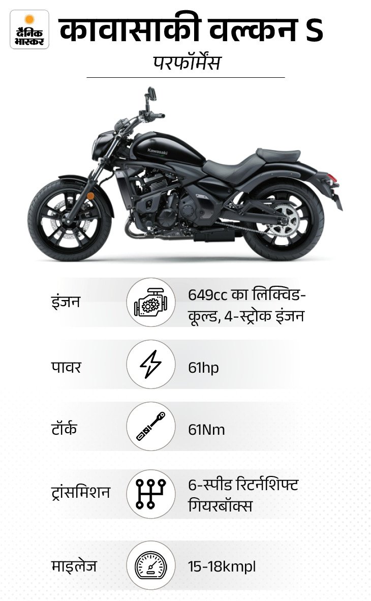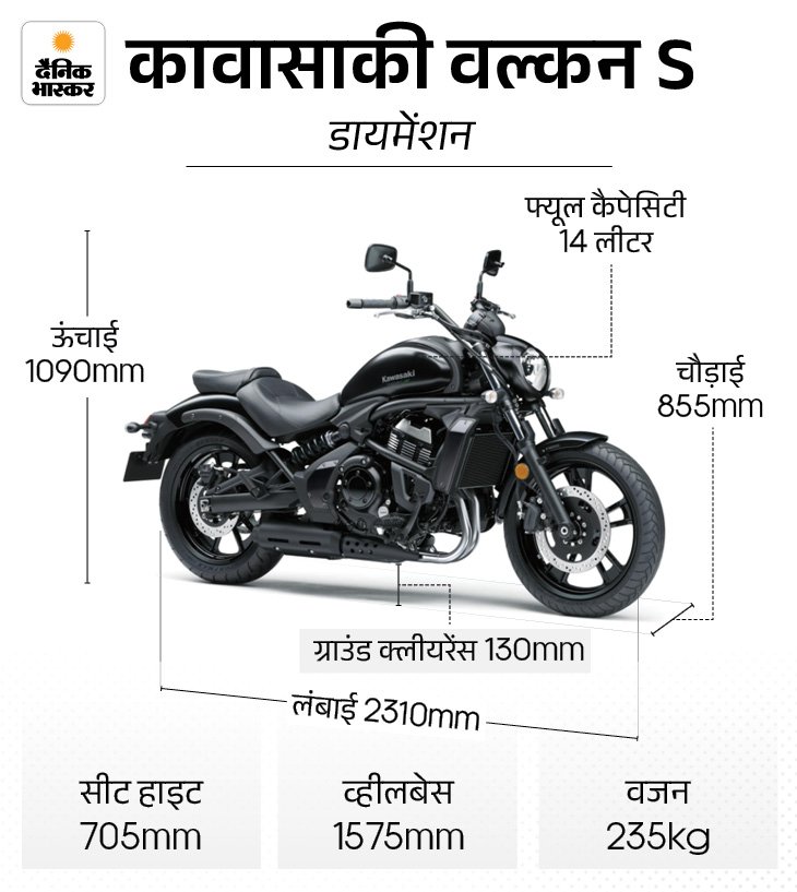 बाइक के डायमेंशन में कोई बदलाव नहीं किया गया है। इसकी सीट की ऊंचाई सिर्फ 705mm है, जो कम हाइट वाले राइडर्स के लिए काफी आरामदायक है। इसका ग्राउंड क्लीयरेंस 130mm है। वल्कन S का क्लासिक क्रूजर डिजाइन, लंबी दूरी की यात्रा और आरामदायक राइडिंग पोजीशन के लिए जाना जाता है। कावासाकी ने 2026 मॉडल के लिए पुराने ‘पर्ल मैट सेज ग्रीन’ कलर को हटाकर ‘मेटालिक फ्लैट स्पार्क ब्लैक’ कलर पेश किया है।